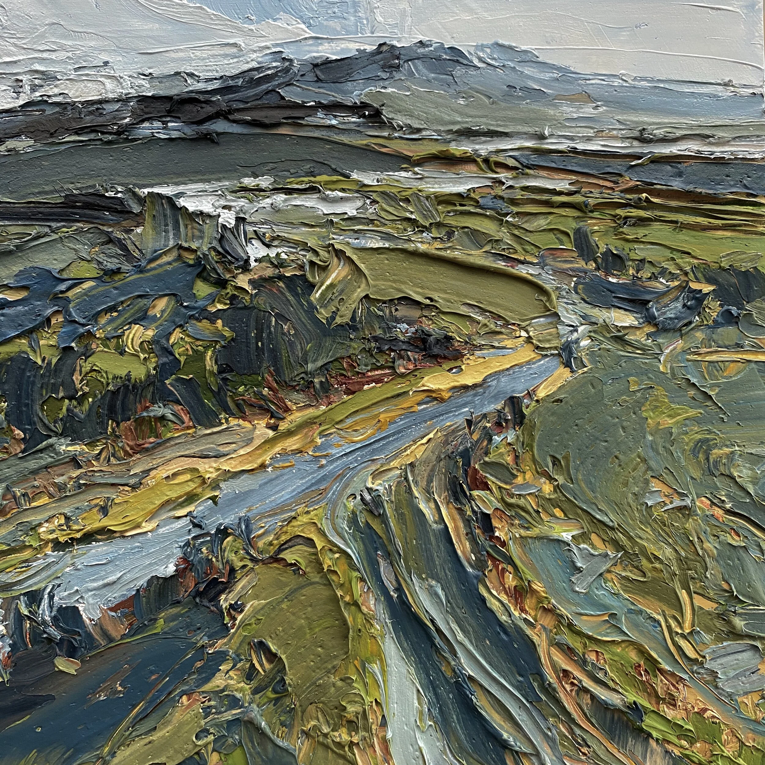 All works in the Surface Tension series are made with artist oil pigment, cold wax medium and marble dust, on cradled gallery panels. They are unframed, but wired and ready to hang, with sides painted black. We ship smaller works to any destination world-wide, at no additional charge.